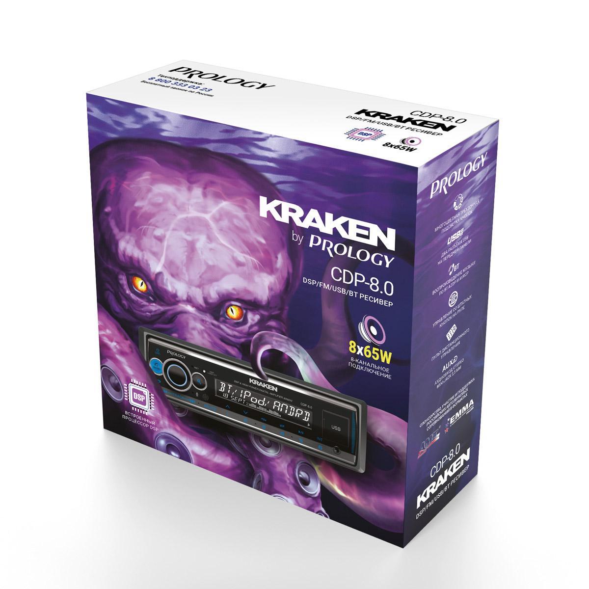 Prology CDP-8.0 KRAKEN — представитель нового класса головных устройств высокой мощности. Восемь каналов усиления с максимальной мощностью до 65 Вт позволяют построить громкую аудиосистему без дополнительных усилителей, а звуковой процессор — добиться впечатляющего звучания.